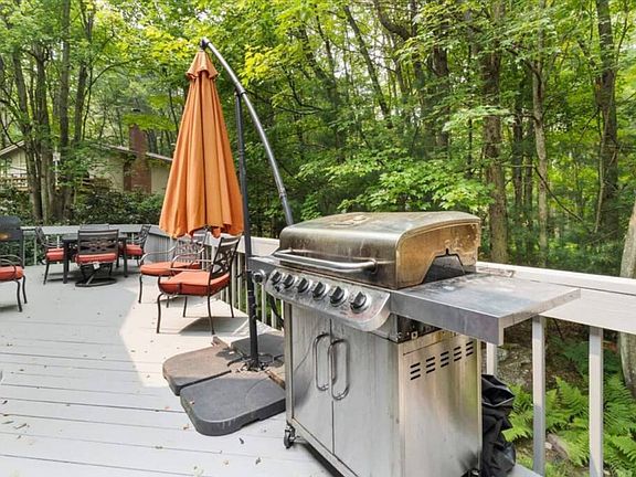 Come enjoy the beautiful Poconos at this lovely family home! The chalet features sleeping for 10, fast Wi-Fi, a fully equipped kitchen, vaulted ceilings, two different decks, and a bright sunroom. Perfectly located in the Poconos, it is close to skiing and summer vacationing. The minimum age to rent is 25 years old. Enter through a large, newly tiled hallway into a bright and spacious living room with a wood-burning fireplace, a 2-story vaulted ceiling with skylights, and two sliding doors leading to a large outdoor deck. Relax in a bright sunroom with a vaulted ceiling and five windows, with a door leading to the rear deck. The first floor has one full bathroom, two bedrooms (one with a queen bed and one with a twin bed and twin bunk bed), a mudroom, dining room, and large kitchen with new granite counters, backsplash, and stainless appliances. The second floor features a loft overlooking the living room, one full bathroom, and two bedrooms (each with queen beds) with vaulted ceilings. This home is located on a quiet street, surrounded by beautiful greenery. It is within walking distance to the main beach, clubhouse, and outdoor pool. The entire house is available for your stay. If you are booking for more than 7 nights, you may be eligible to access Lake Naomi beaches and pools. Temporary memberships are limited, so inquire about availability prior to booking. You will be responsible for reserving the passes, paying any associated fees, and picking up the passes. Dogs are welcome for a fee of $250 per pet. Inform us at the time of booking if you will be bringing a dog. Lake Naomi Club is a premier Pennsylvania recreational community located in the pristine Pocono Mountains of Northeastern Pennsylvania. At the heart of this Platinum Club Community is a 277-acre lake with non-motorized boating, fishing, swimming, and sailing. Lake Naomi Club also features an outdoor Olympic-sized pool, a second outdoor pool with an aquatic climbing wall, a 9-hole executive and private golf course, the top-rated tennis center complex in Pennsylvania, a clubhouse with a restaurant and pub, and a dedicated recreational staff offering activities for all ages. The community center boasts a multitude of amenities including an indoor pool with a splash park, indoor tennis, a fitness center, a game room, a teen area, and activities for the entire family. Surrounded by nature and nestled in mountain serenity, Lake Naomi and Timber Trails offer Pennsylvania vacation homes and rentals at a great value, providing a unique mix of peaceful retreat and convenient shopping. Due to township regulations, we cannot host more than 10 overnight guests.