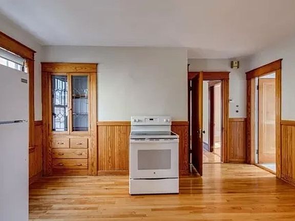 This apartment boasts three generously sized bedrooms and a full bathroom, perfect for those who value space and comfort. The interior features beautiful hardwood flooring, adding a touch of elegance to your living space. The kitchen is equipped with a refrigerator and an oven, ready for your culinary adventures. For your convenience, the home includes an in-unit washer and dryer and garage parking.