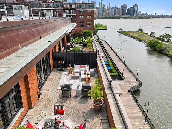 Sugar House Direct South Facing Penthouse with Massive, Private Terrace! A once-in-a-lifetime opportunity to own a direct South facing Sugar House Penthouse has finally arrived. Perched atop the iconic Sugar House, Penthouse F is a gorgeous 2 bed/2 bath home offering over 1,700 sq. ft. of indoor/outdoor living, and is one of only four, ultra-luxurious Penthouse residences to feature SPECTACULAR panoramic, unobstructed, and protected views of the Statue of Liberty, Verrazano Bridge, Hudson River, and beyond! A generous 1,236 sq. ft. of beautiful interior layout leads directly onto your approx. 500 sq. ft. terrace with dining, lounging, entertaining, and grilling area. Fill your days watching the ships navigate the harbor, enjoy some cocktails and alfresco dining, and lounge the hours away. As day turns into night, marvel as the brilliant sky transforms, as planes fly off in the distance, and Lady Liberty's torch shines. Inside Penthouse F you'll find only the finest finishes of stone, wood, and marble, featuring high gloss crema marfil stone floors with "noir" detail inlays, a professional grade Viking and SubZero kitchen with chef's counter, open concept living/dining room with roaring gas fireplace, massive window walls and French sliders leading to your exterior paradise. The principle bedroom suite is truly grand in scale, and could easily accommodate a home office, nursery, or seating area, as well as a spa-like tumbled marble bathroom with jetted tub and two person shower. A skylit second bedroom with built-in home office and huge walk-in closet awaits on the other side of the home along with another opulent bathroom. One private garage parking space in the onsite garage is included in the sale. Located directly on the Paulus Hook waterfront, the 5-star Sugar House features 24 hour concierge/security, fully equipped gym with Peletons, steam room, dry sauna, trainer locker rooms, and a spectacularly manicured resident outdoor terrace with mature plantings, professional grade gas grills, lounge, dining, and play areas. Enjoy this magnificent neighborhood with the best dining, nightlife, shopping, parks, coveted PS16/Bradford school district, and the new Whole Foods market right up the street. Minutes to NYC via Path, Ferry, or car, as well as the NJ Turnpike, and shore points. The rarest of chances to seize the occasion!