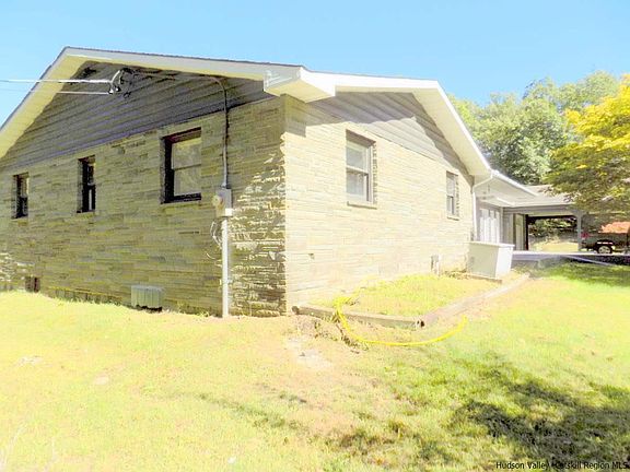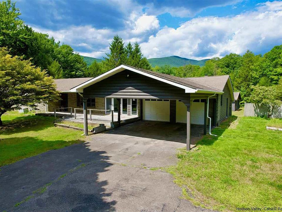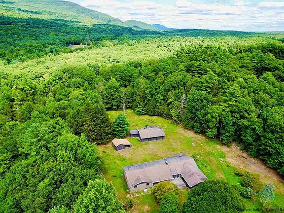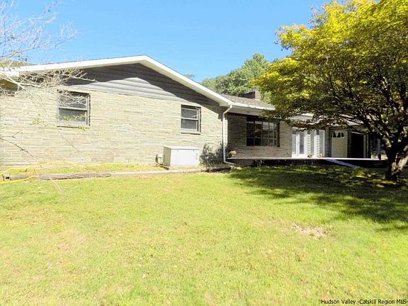 Mid-Century Mini-farm in the Mountains! This fab bluestone and log sided 3 bed, 2 bath ranch with lots of original mid-century details is sited on 7 beautiful acres with views and a small pond in a beautiful area just below the high peaks of the Catskills. The home has an open feel with a stone fireplace in the living room, a South facing deck and a large two car garage with additional covered parking. There is a whole house generator and an enclosed breezeway connecting the house and garage which is not included in the square footage. In addition, there is a newer 1,200 square foot garage/studio building located behind the home as well as a shed and several lean-to's. So many options here, great for goats and chickens, an artist, craftsperson, car collector, ETC. Located not too far from Woodstock, Stone Ridge and Kerhonkson. There is a small country convenience store within walking distance. Recreational opportunities are many. Very fairly priced below assessed value!
