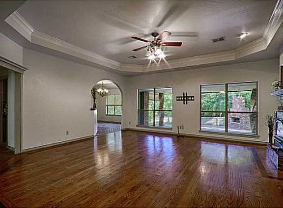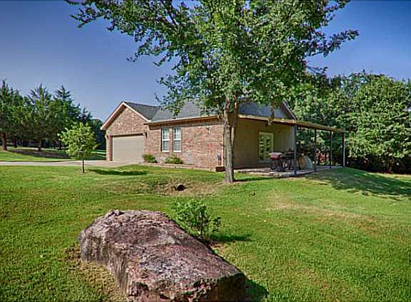 Beautiful Home on 2.35 Acres With Small Shared Pond Detached 2 Car Brick Garage/shop wired for 220 and an additional 600 sq. ft attached hobby room with heat and air and Full bath and large covered patio separate Elec. meter and sprinkler syst. Home has Lg Kit, with brick flooring, oversized pantry, brkfast bar, 2 dining areas, out door fireplace & Hot tub, real wood fls in living area, Master has oversized shower and dbl vanities Walk in closet