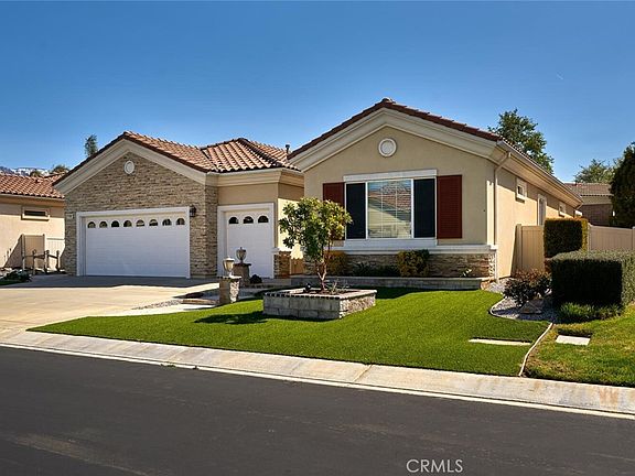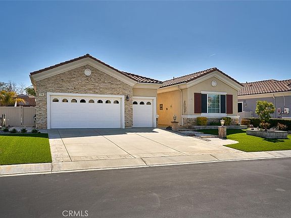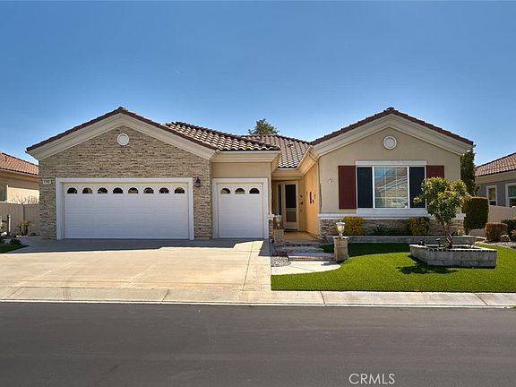 A very special home awaits you in the peaceful and private 55+ community of Solera in Beaumont, CA. MOUNTAIN VIEWS FROM THE BACKYARD! Huge low maintenance lot with a great backyard for entertaining. Over 10,000 sq ft. lot! Newer air conditioner/furnace. Walking distance to small neighborhood park. There’s a covered patio that extends across the entire back of the home! Enjoy a BBQ island with a stove and sink. Decorative concrete covers much of the yard, but planters with trees and shrubs and a built-in fire pit make the backyard inviting. Three ceiling fans on the patio keep it cool on those warm summer evenings. Upgraded sidewalk and planters in front yard. Front screen door. Popular stone trim exterior. 2 bedrooms, 2.5 baths and a den/office. Tiled halls, ceiling fans throughout and epoxy flooring in the garage. All appliances stay with the home! Solera residents enjoy the beautiful clubhouse, with a gym, heated pool and spa, as well as meeting rooms for classes and parties. Welcome to the good life!