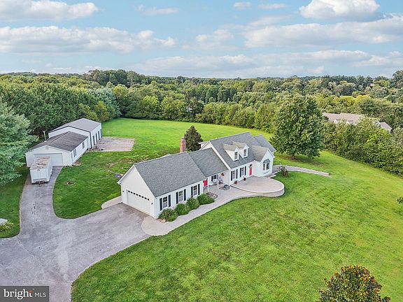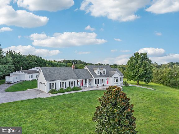 RARE OPPORTUNITY  AND WHAT A  VIEW. One floor living  nestled on 5.6 acres of pristine, grass-covered land, this custom Cape Cod home offers breathtaking views and unmatched tranquility in one of Carroll County's most desirable areas. This charming home features a large primary suite on the main level with a bonus room attached, perfect for a nursery, mega closet, or additional office. Two additonal bedrooms and full bath upstairs. The property includes two additional detached garages. Whether you're seeking a serene retreat or a versatile property for car enthusiasts,  homesteading, or a small business, this property  is a perfect fit. Mature trees surround the property  creating a peaceful, private setting. The man cave is  24 x 50 feet, insulated and wood stove-ready, complete with cable , a concrete floor, an electric hook-up for an air compressor, and an oversized 8' x 16' overhead door. This connects to the Mechanics 4 bay garage  which offers four 8' x 8' overhead doors, electric service, and a large slider at the end. The sellers have maintained the home well, with waterproof LVP floors, updated  windows, kitchen, a 12-year-young roof, and fresh paint throughout.  Enjoy the spectacular views and the convenience of main-level living with a spacious first-floor primary bedroom, accompanied by an office, a large updated kitchen, and a cozy family room with a fireplace that opens into a sunroom, perfect for soaking in the natural light and beautiful surroundings. Two additional bedrooms and a full bath upstairs provide privacy and comfort for family or guests. A large front patio offers the perfect spot to relax and enjoy the incredible view of your expansive property.  This unique property provides endless possibilities for its next owner. Whether you envision it as a family homestead, a base for your business, or a personal retreat, the choice is yours. Schedule a showing today and experience the beauty and possibilities of this Carroll County gem!   Check out the video tour and Interactive Floor Plan. Book Online with your agent or Visit the Open House