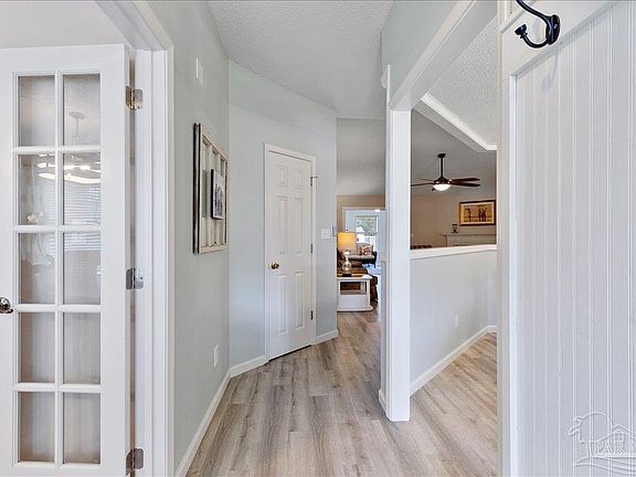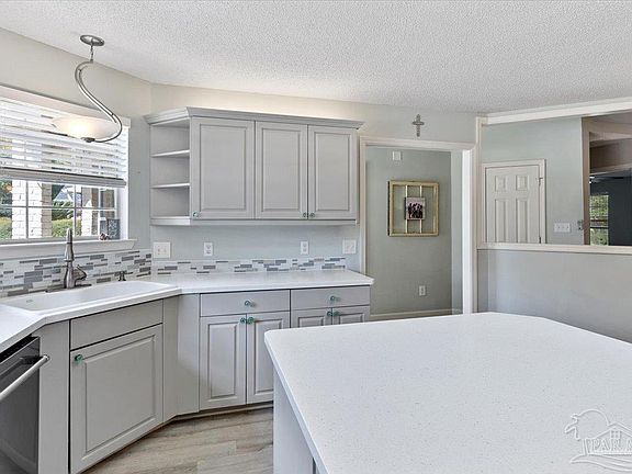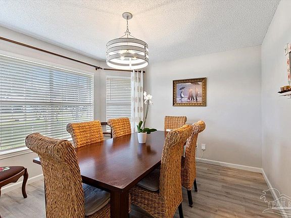 Welcome to your dream home in Waterfront Community where you are walking distance to community access to the Santa Rosa Sound! This updated 3-bedroom, 2-bath residence has large sunroom, great room with fireplace and flex area that can be office, formal dining or fitness area. Newly updated with luxury vinyl plank flooring throughout, designer “sea salt” paint, new fans & light fixtures giving style and comfort. The heart of the home features an updated kitchen with large island, Corian countertops, and newer stainless appliances—perfect for both cooking and entertaining. The generous master suite offers a tranquil retreat with a spacious bathroom that includes a large, tiled walk-in shower with bench, double vanity, and two closets for ample storage. Step outside to a large, fenced lot that provides privacy and a wonderful space for outdoor activities. The property is equipped with a sprinkling system for easy lawn care, 2024 Roof, 2024 water heater, yard building with 20amp, metal hurricane shutters and laundry with washer & dryer. Located in a charming waterfront community, you’ll have access to the Santa Rosa Sound, making this home an ideal escape for water enthusiasts. Don’t miss the chance to make this exceptional property yours!
