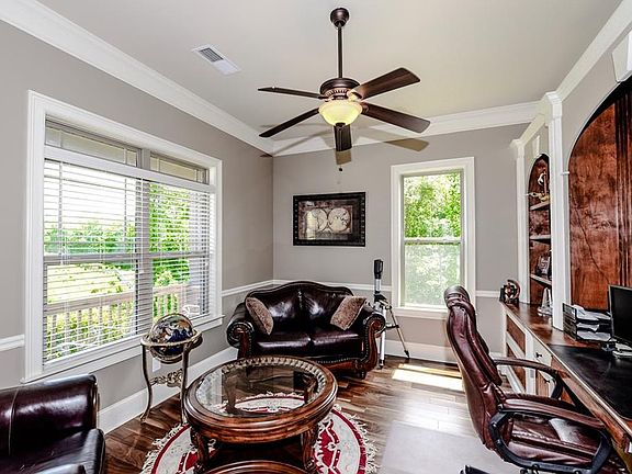 If there is a perfect home, could this be it? To say it is a brick front 3 car garage home situated on a cul-de-sac doesn't do it justice.. As you drive up to the house, you'll notice the unusual characteristics as it sits on the edge of a ridge in the back of the neighborhood surrounded by 15+ acres of natural woodland with a babbling creek with several small waterfalls running along the side of the home that can be enjoyed year round while sitting on your covered rocking chair front porch or the screened in 10X 24 screened porch out back. You'll also notice the dramatic landscaping with multiple tiers and retaining walls all nicely landscaped with roses, azaleas, gardenias, crepe myrtles, and laurel pedlums. The back yard also features a back gate with staired private walkway to the creek. This is an unbelievable haven that can't be found this close to civilization. The outside is amazing, but the real excitement starts when you open the front door to the 2 story foyer featuring extensive molding and Real Acacia Hardwood floors that are not typically found in the Eastern U.S. As you continue into the home, the Wow factor continues with the Large open floor plan with10+ ft ceilings on main floor and windows galore to enjoy the once in a lifetime beautiful private views. The Kitchen sits in the middle of the home featuring Stainless steel appliances including double ovens, granite counter tops, and walk in pantry. The 12' long bar separates the main kitchen from the eat in area. To one side of the kitchen is the Keeping room featuring a floor to ceiling stone real gas fireplace. On the other side is the family room with it's own floor to ceiling stone fireplace accessible through several beautiful arched entrances between the kitchen and family room. Beside the family room sits a 12+ person dining room with a pair of arched entrances as well. Both the family room and dining room feature trey ceilings. This home was perfectly designed for the work at home family as it features 2 separate offices. The first office you have already noticed right off the foyer sporting double French doors featuring a full wall custom built in desk and shelving. The other office is tucked in quietly on the other side of the house. Upstairs provides 5 oversized bedrooms and 3 full baths. Master bedroom has a separate sitting area with a third Stone fireplace to match the 2 on the main level. All bedrooms have vaulted ceilings with many windows. One bedroom is already setup as a movie room with surround sound and a 150" screen. You'll also appreciate all rooms have walk in closets, and three additional closets upstairs. The unfinished basement also has 11+ ft ceilings perfect for finishing into separate 2100+ Sq ft living quarters or an excellent entertainment level. The 3 car garage, is also unique in that it features plenty of room for storage, but allows for 6 cars instead of just 3. We currently park 4 cars in the garage.