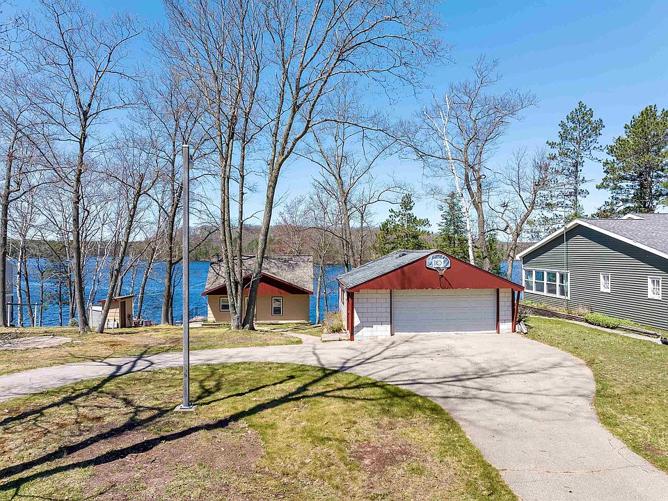 Prime Northwoods Lakefront! Ideal location on Boot Lake across from national forest providing gorgeous natural backdrop that allows you to watch the sunrise & set from your own cabin. This full rec lake offers sand bottom & extremely clear water. Enjoy swimming, water sports and excellent fishing from the 120’ of shoreline featuring removeable dock with bench & platform to the dockside ‘fishing shack”. Boat lift and swimming platform are included. Easy access to property through circular driveway to garage, complemented by 2 more storage sheds. Home and land offer outstanding water views. Living room has wall of windows overlooking lake. Kitchen is fully applianced and there is a large dining area to accommodate family and friends. Main level bedroom and an oversized bunkroom upstairs.