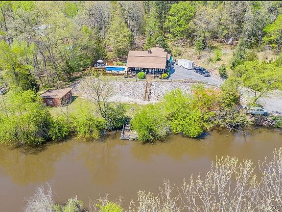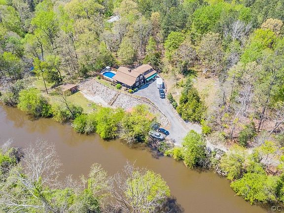 TRANQUIL SETTING! PRIVATE but close to shopping, theatre, restaurants! Huge "rocking chair" front porch has WATER VIEW! Home has PINE WOOD floors throughout ENTIRE home. Small amount OF carpet on stairway can be removed. Very LARGE Den/Family room has gas FIREPLACE & leads out to LARGE deck w/POOL. Enjoy Winter by the fire and Summer by the pool!! The SPACIOUS eat-in kitchen features a large island and another gas FIREPLACE in dining area. Ceiling fans throughout! Home essentials are WELL - MAINTAINED! ROOF is approximately 11 years old; HVAC downstairs is only 2 years old and upstairs unit is 6 years old; Electric WATER HEATER is 5 years old. The 36 x 16 pool is 4 feet deep & well-maintained, with a NEW liner and cover. Perimeter is equipped with an underground DOG SECURITY SYSTEM. HUGE 20 x 40 GARAGE holds at least 4 vehicles. Large storage shed (could be used as a workshop with a new floor) and a smaller storage shed in backyard for lawn mower, pool equipment storage, etc. MUST SEE to APPRECIATE the WATER VIEW! $5000 OFFERED toward BUY DOWN of POINTS or CLOSING COSTS with FULL PRICE OFFER!