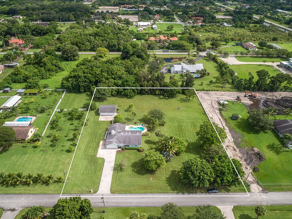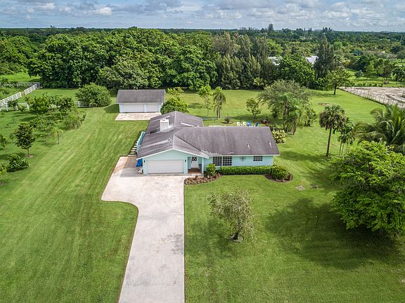 Looking for room to roam? Almost two acres in the heart of Rolling Oaks at Southwest Ranches. Set back on a quiet street with mature landscaping. Fully fenced pool area with covered patio. Three spacious bedrooms all with ample size closets. Renovated baths and kitchen. Fireplace in family room. Cabana bath services yard. Newer water heater and A/C. Out building currently used as a three car garage (1,194 square feet) could be converted to an in-laws quarters or office. 200 ft well.