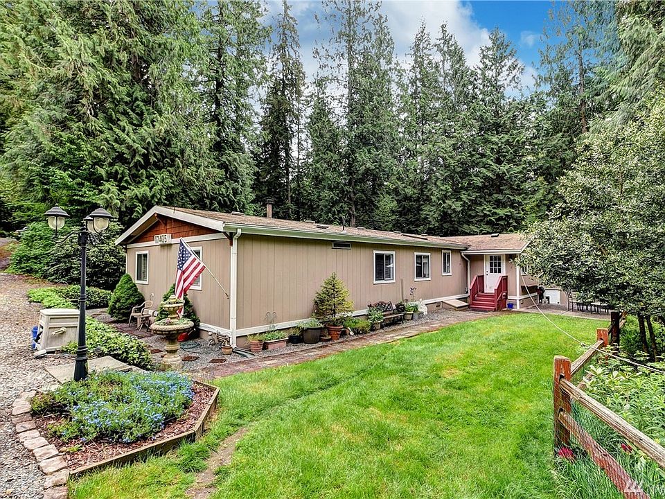 Come see this darling 3 bd 2 ba home on 2.9 acres. Only minutes from Duvall but it is truly country living. Listen to Cherry Creek from your hot tub off the master. Wonderful floor plan with master on one side and 2 bedrooms and den on the opposite side.Lots of living space with a cozy wood burning stove. Several patios and lots of parking. Only a quarter mile from Cherry Falls Rec area. Two outbuildings, work shop and shed, and lots of space to add a garage. New roof going on tomorrow.