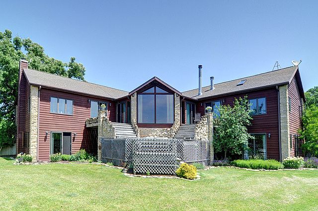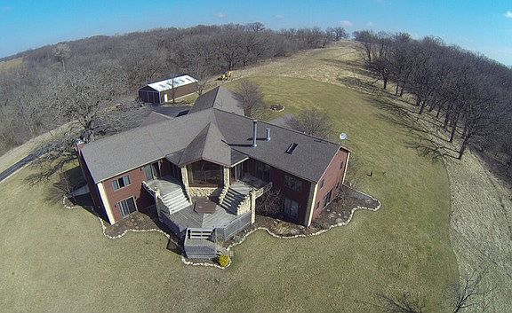A DREAM HOUSE and a SPORTMAN'S PARADISE with VIEWS FOR MILES! You must see this to believe it! 6,000+- sq. ft. home on 22.04 SURVEYED ACRES has knotty pine volume ceilings with exposed beams and custom paint throughout. Main floor oak trim and floors. Hexagon shaped kitchen is open and in the center of all main floor living areas. Kitchen, living room with filreplace, sunroom, and dining room are all wide open and flow effortlessly into each other. Main Floor Master Bedroom with fireplace and private full bath. Lower level offers movie theater, bar, family room, bedroom, and 2 baths. 2 furnaces, 2 air conditioning units, 2-50 gal. water heaters. Native limestone for fireplace was mined off of the property. Casablanca fans, Pella window, paved driveway. 3 decks - 1 for sunrise, 1 for sunset, and 1 for full sun plus 4 person hot tub. 1 pole building in included. 8,000 watt backup generator, 4 car attached garage. POOL TABLE, BAR STOOLS, ALL MEDIA EQUIPMENT AND MEDIA ROOM CHAIRS STAY. MEDIA SCREEN IS 80" X 58"