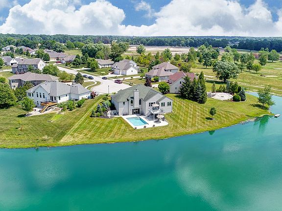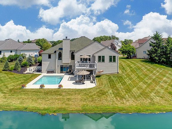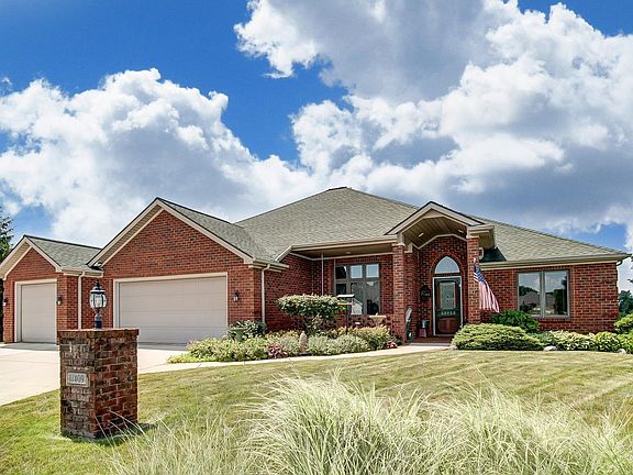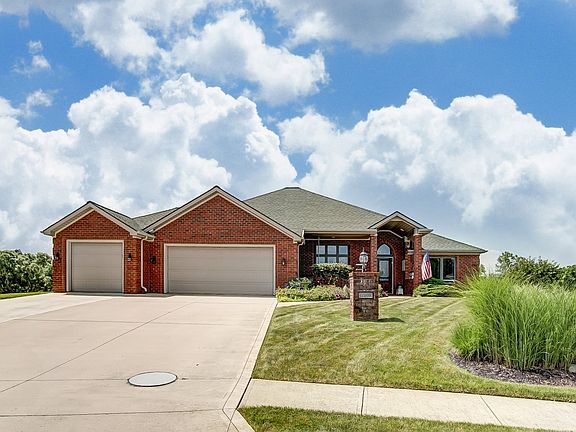 Stunning lot located at end of the cul-de-sac with a pond view backing to the tree line and field. This ranch home shows owner pride throughout! Walking up to this all brick front home you will fall in love with the southern oversized brick front patio. You will also love all the professional landscaping and irrigation system offered. French doors on the front office/dining room, split floor plan with great views as you enter the Great Room. The Great room has a custom mantel for the gas start wood burning fireplace and customized cathedral windows. The Kitchen has custom tile floor and beautiful Quartz Countertops. Kitchen appliances are all only 3 years old! Off of the dine in kitchen you will find the Hearth room where you can enjoy all the views the back yard has to offer! Pocket doors connect you the Master Bedroom. The master bath offers a tile floor, wainscoating, a jetted bathtub, and a nice walk in closet. In the walkout basement you will find a great entertaining area, an extra room and a storage/workout room. Outside you can relax or entertain on the 14x14 upperdeck or the covered patio below along side the 29x16 in ground sport pool. This home is definitely one you won't want to miss out on!