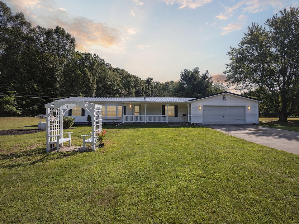 Beautifully remodeled ranch home tucked away on over 5 acres with two-car attached garage. This well-appointed home features an open floor plan with cathedral ceilings. Enjoy an all-new kitchen with tiled backsplash, breakfast bar and butcher block countertops. Primary suite offers walk in closet, 4-piece bathroom w/soaker tub. Guest wing offers two bedrooms/full bath. Enjoy convenience of mudroom off garage and main floor laundry. Flex room could be 4th bedroom, home office, family room or exercise space! Enjoy covered front porch & entertain on generous sized deck overlooking your private back yard! Fenced area for garden/pets, extra storage in shed & barn. Your worries are few with a brand-new steel roof. This feels like a brand-new home throughout- must see to appreciate the quality.