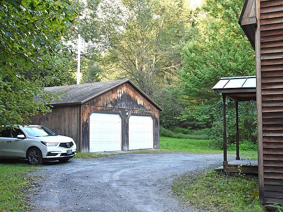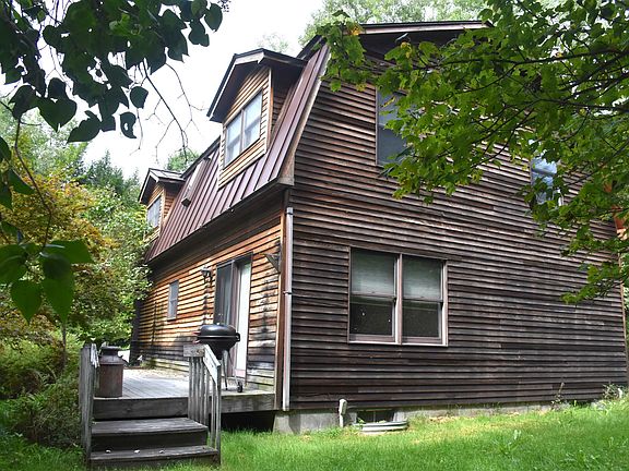 The Sheffield, is a 3-BR, 2-bath Gambrel on 10.1 +/- mostly woodland acres in West Berlin. First floor has a large living room, separate corner dining room with exit doors to the private deck. Oak cabinetry in the U-shaped kitchen. First floor den/office with closet could easily become a ground-level bedroom. Full bath with shower/tub, and an adjacent laundry room with front loading appliances. Upstairs, there is a full-depth primary bedroom with two double closets. The second upstairs bedroom is also enormous! Plus there's a third upstairs bedroom on the southeast corner, currently used as an office. The upstairs bath is located straight ahead at the top of the stairway, with one-piece shower/tub, and double-sink vanity. Basement has noticeably impressive concrete walls and flooring with 7 1/2+/- tall ceilings. Great space for a workshop. Bulkhead access. Covered entry porch and standing seam metal roof, too! Detached 2-car garage with auto openers, and attached shed storage. A little paint here and there would result in a quick, easy and transformative refresh! Fresh eggs for sale at the farm store next door, too.