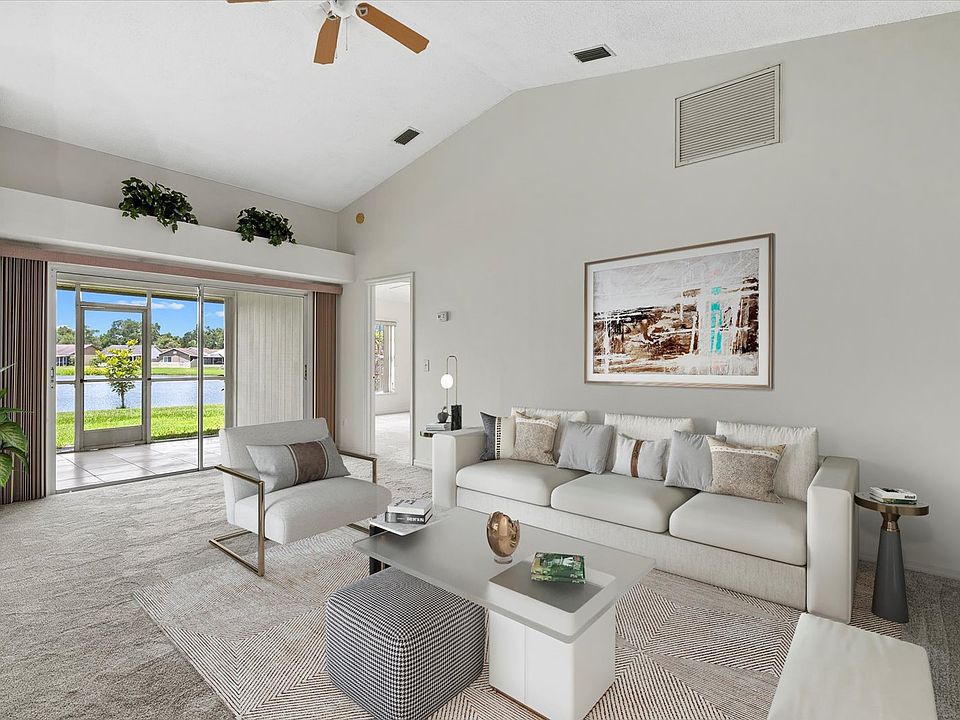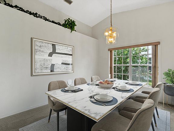 The spacious open floor plan has cathedral ceilings & brand-new carpet. The large living and dining areas flow seamlessly into the kitchen with a new dishwasher and a new washer and dryer in the adjacent laundry area.