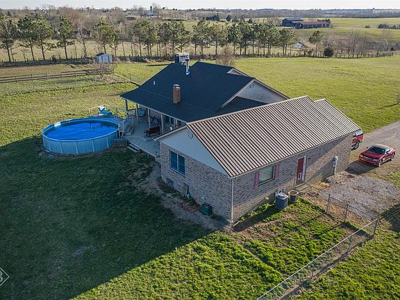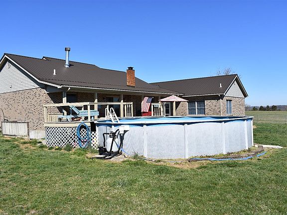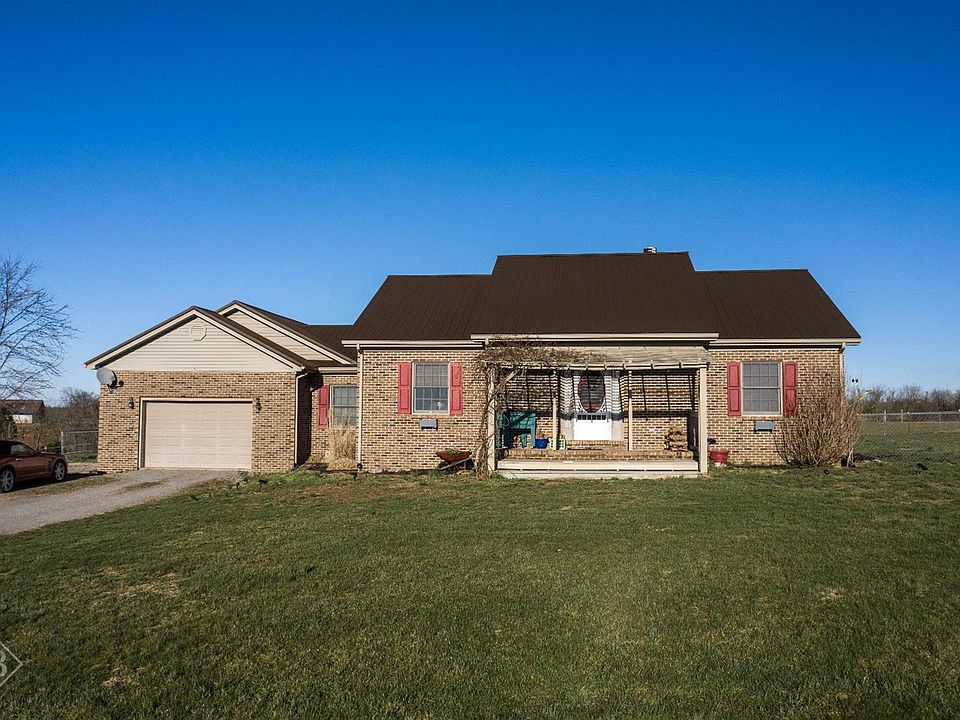 Immaculate home & farm. Open concept-split bedroom plan-two foyers (front and back doors)-combination of hardwood in main part of house-tiled baths-carpet in guest bedroom-laminate in master and guest bedroom. Large family room overlooking farm land for miles with a woodburning fireplace-partially open to the kitchen. Kitchen has lots of granite countertops- plenty of cabinets-built-in breakfast area-all appliances-adjacent formal dining room. Large/roomy master bedroom/bath-engineered hardwood flooring-his-and-her closets-garden tub-shower-lots of light & views of farmland. Roomy guest bedrooms share a hall bath. Utility room & back foyer are perfect for coming in from the farm and shedding coats and boots. Beautiful views front & back of property make it perfect for front porch sitting or on the large deck. Five stall horse barn, three paddocks, area for working horses, small hay storage shed and fenced yard for pets. Perfect small equestrian set up. Close to the KY river.