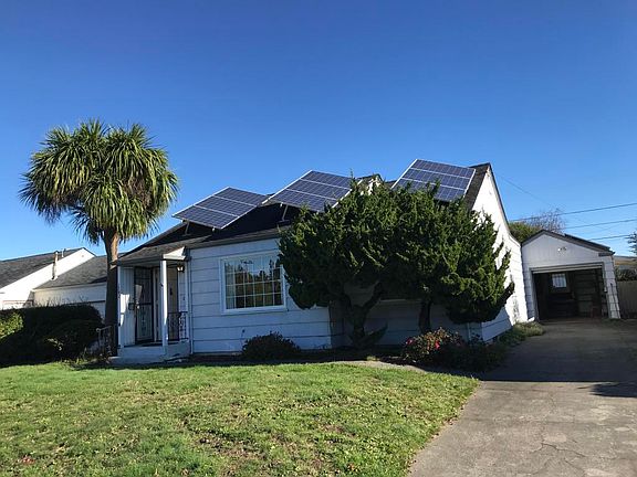 This bungalow has the charm of a bygone era with modern additions. 2 bedroom 1.5 bath home with quaint kitchen, hardwood floors in part of the house, living room has a fireplace and curved wall that adds to the character, 1 bedroom has direct access to covered patio, a bonus room with fireplace also leads to covered patio through sliding doors. The yard has fruit trees, lots of flowers and other trees. Home has solar panels and dual pane windows! Needs some TLC and a little paint to make it your own. Located on the East side of Eureka, between Henderson center and Myrtle Ave.