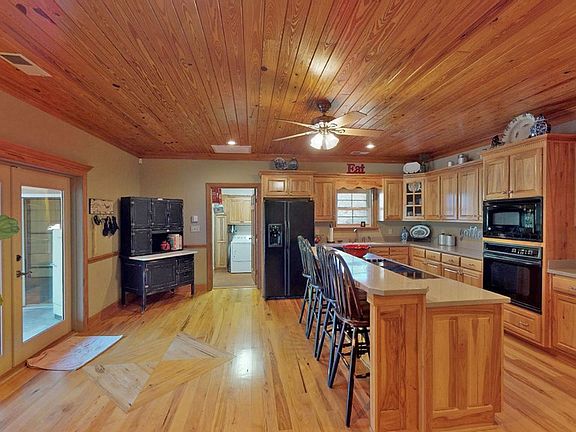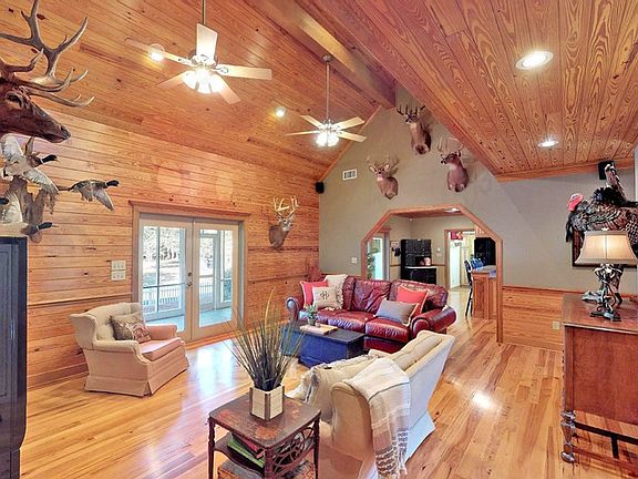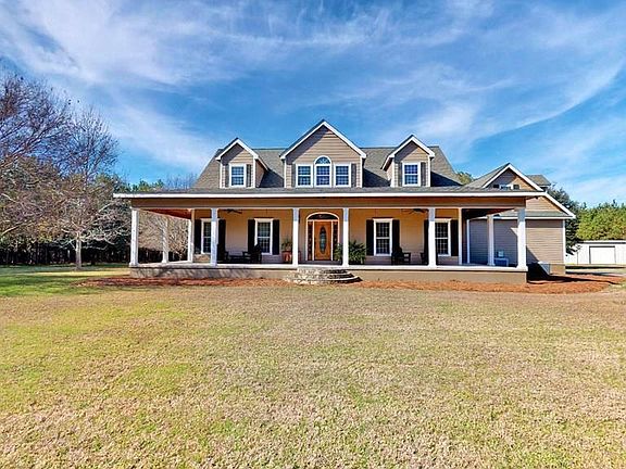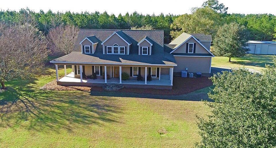 SECLUDED AND PEACEFUL!! This home is clear of the lights and sounds of the city! This beautiful 4 Bedrooms/3.5 BA home sits at the end of an oak lined private drive surrounded by pines, featuring a wrap around porch, & 45.5 +/- acres. Inside you are greeted by a 2 story tongue & groove ceiling, hickory floors, & pine wainscoting. An arched doorway connects the cozy family room to formal dining w/ crown molding & pine ceiling. Kitchen has hickory cabinets, island w/ break bar, all major appliances & abundance of cabinets. Luxurious master bedroom has hickory flooring, & pine ceiling. Master bath is tiled, has double sinks, tiled shower, walk-in closet, & pine ceiling. Upstairs are 2 beds and a bath. Laundry room w/ brick flooring. Guest suite above garage w/ large bedroom & full Bath. HURRICANE PROOF WINDOWS; 3 Central Heat and Air Units. 25x63 Metal Shop w/ 3 roll up doors & fireplace. 25'' lean to on back; dog kennel; irrigation system and so much more!