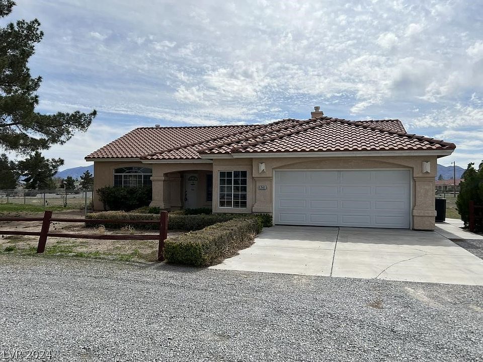1 story home with 3 bedrooms and 2 baths located in Pahrump. Inviting floor plan with lots of living spaces! The kitchen features an island, tile countertops, and tile flooring. There is a wood burning fireplace in the primary bedroom and the additional living area. Show today! All figures and measurements are only approximate. Buyer is to verify schools, HOA, measurements and utilities.