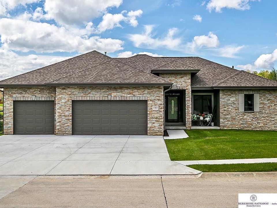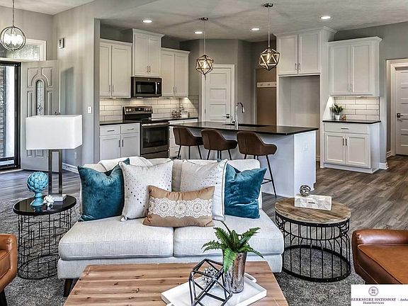 Open floorplan backing to trees by Mercury Homes! This walkout ranch floorplan has 3 bedrooms on the main floor with the master suite on separate side from the other rooms. Large center island in kitchen with white cabinets and modern fixtures. Stacked stone fireplace and tons of natural light throughout. Drop zone off garage which is zero-entry and no steps. Covered deck off the kitchen to enjoy the peaceful setting with no backyard neighbors. Finished basement has bedroom, bathroom, rec room, wet bar and theater room! Darling front porch. Walk to private neighborhood pool and nearby trails.