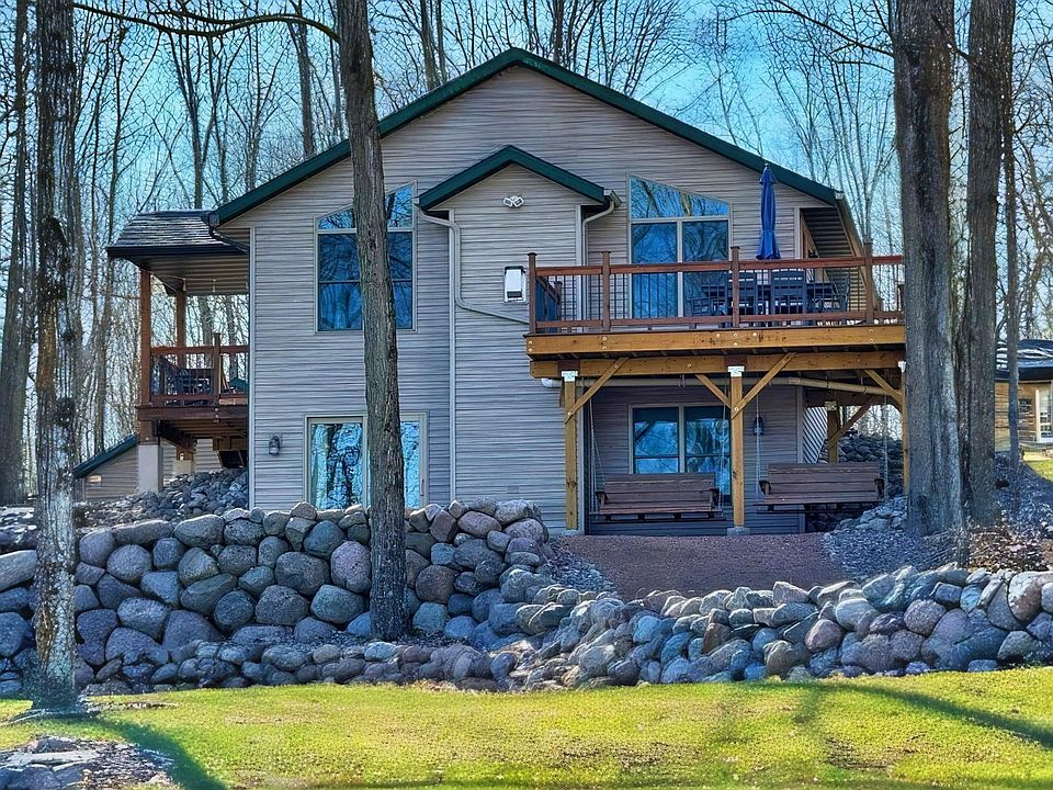 You will fall in love heading down the tree lined driveway. This stunning ranch home with walkout LL is just perfect! Open kitchen/DA/great room with vaulted knotty pine ceilings & stone floor to ceiling fireplace. Appliances stay for you along with more items. Two nice size BR & full bath on main level. Family room in LL has a bedroom with walk-in closet, full bath and patio doors that lead you to a piece of paradise. Beautiful landscaping leads you to your firepit complete with wood storage area, dock and breathtaking views. Relax on one of two swings. Three car garage + shed. Enjoy this incredible year round home where you can enjoy all the seasons. Channel is nowake and the lake is a motorized lake. Showings begin 5/27.