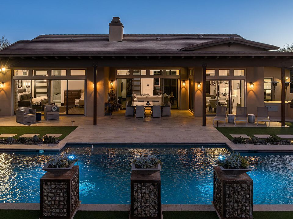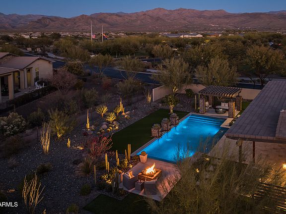Welcome to this stunning former model home with modern designer finishes throughout. This home features 3 bedrooms,3 bathrooms, an office, a gourmet kitchen, and a resort style backyard. The great room captivates with its tray ceilings, sleek modern fixtures, abundant natural light, immersive surround sound, and a charming built-in 3-sided fireplace. The gourmet kitchen stands out with a waterfall breakfast bar island, high-end stainless-steel appliances, double ovens, a pot filler, and a built-in refrigerator. The primary suite is a true retreat, offering surround sound, a sliding glass door to the backyard, shutters, and a spa-like ensuite with dual vanities, under-cabinet lighting, and a huge walk-in shower complete with a soaking tub. The oversized walk-in closet includes built-in drawers and shelves. Bedrooms 2 and 3 are move-in ready with shutters and walk-in closets. The front bedroom has a private ensuite! The laundry room is fully equipped with cabinetry and a sink, while the garage offers storage and epoxy flooring. Step into your private backyard oasis, where every detail is designed for relaxation and enjoyment. An expansive covered patio provides the perfect space to unwind, complemented by a built-in BBQ and a pergola overlooking the heated pool with tranquil waterfalls. The Sonoran-inspired landscape adds natural beauty, while critter fencing ensures both comfort and peace of mind in this thoughtfully designed outdoor retreat. Do not miss out on this luxurious home.