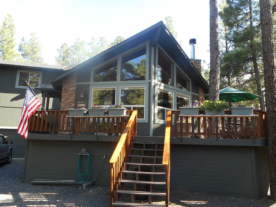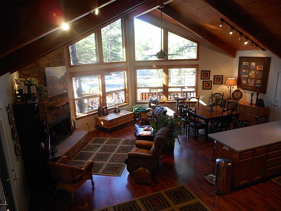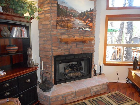Phenomenal home situated on third of an acre at the top of a quiet cul-de-sac in Pinewood Country Club. Soaring ceilings enhance this open and inviting home with hardwood laminate floors, tongue and groove ceilings and expansive windows bringing the outdoors inside. Lots of counters in kitchen opens to dining and living space. Master Bedroom suite with on-suite large master bathroom on the main level. Two additional bedrooms upstairs and a giant family room with gas fireplace. Both fireplaces have stone front and propane gas. There is a wonderful side screen enclosed covered patio perfect for enjoying the monsoon rains that happen every summer. Lots of trex decking surrounds the cabin. Oversized two car garage with workshop and tons of storage. Separate stand-alone carport A True Gem