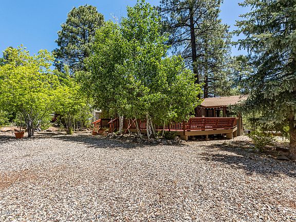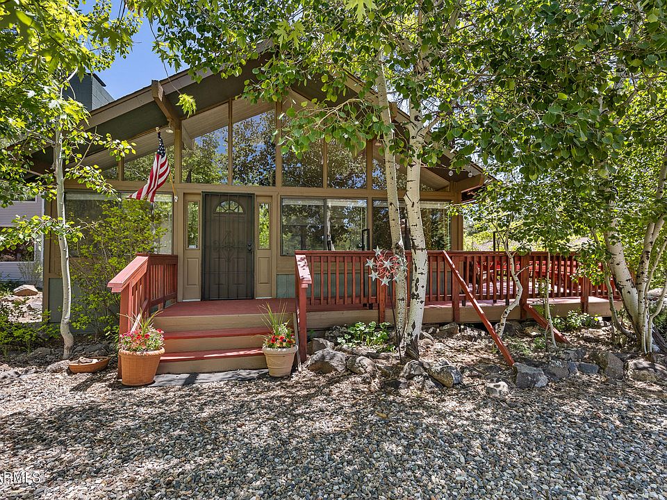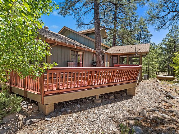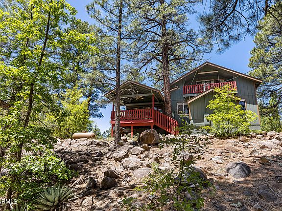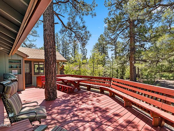 There's one thing you can't change about a house that's it's location. Nestled on over a 1/4 acre lot on a quiet cul-de-sac and overlooking a canyon with a seasonal stream, this four bedroom (PLUS an additional bonus room) cabin has it all. Nestled in the trees, this lot is loaded with pines and aspens. There's an abundance of outdoor living spaces including an oversized wraparound redwood deck and another that sits off the back. Inside, the open floor-plan is perfect for entertaining and family gatherings while still having a cozy cabin feel. The great room has vaulted ceilings, T&G interior walls and a wood burning fireplace. The updated kitchen flows into the dining area with plenty of seating at the table as well as the extended breakfast bar. There's an abundance cabinets space and a separate pantry. Upstairs, the primary suite has a vaulted ceiling, wood burning fireplace, attached bath and a wall of sliding doors opening to a private deck overlooking the canyon. Central heat and air conditioning. Other features include plenty of parking and a small garage for your side by side. Comes fully furnished with everything you see!