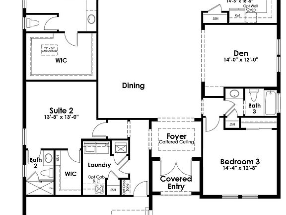 This thoughtfully upgraded 3 Bedroom home sits on a spacious homesite overlooking wooded views and located only a short walk from the community's Clubhouse and amenities. The home's double door Front Entry keeps things light and bright through decorative glass. A spacious Gourmet Kitchen in the rear of the home offers quartz countertops, GE stainless steel appliances, decorative pendant lighting above the Island, and upgraded cabinetry with gray lower and white upper cabinets, soft close doors, full extension drawer glides, and double pull-out trash. The adjacent Outdoor Living Area has been upgraded with a privacy wall and stub out for a future Summer Kitchen. All main living areas, including Den, feature Luxury Vinyl Plank flooring and all baths feature tile to ceiling.* This Move-In Ready home in Cresswind Lakewood Ranch is located in Lakewood Ranch. Some home images may contain additional upgrades, finishes and/or features not included. Floorplan shown is base model and may not include structural options in this home.