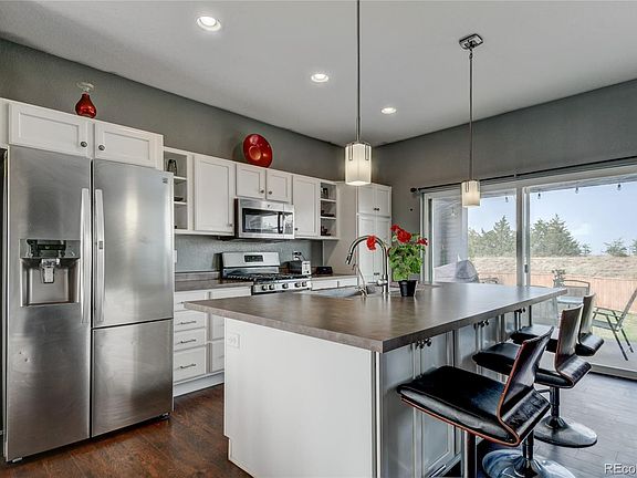 Step inside and enjoy the bright and welcoming atmosphere created by an open floor plan, hardwood floors, and picture windows. The dining room flows smoothly into the kitchen which features a beautiful kitchen island, stainless steel appliances, a gas range stove, and plenty of cabinet space. Large sliding glass doors off of the kitchen open to a covered patio, perfect for enjoying fall evenings and absolutely killer mountain views. The spacious backyard is fenced in and offers plenty of privacy. Head back inside and warm up by the gas fireplace in the living room. Upstairs, you will find two spacious bedrooms and a full bath. The oversized master suite features a large walk-in closet with a sliding barn door. The beautiful ¾ attached bath has a private commode and jack and jill sinks. Washer and Dryer are located on the upper level making laundry a breeze! Unfinished basement space offers potential for more bedrooms or family rec room. Attached two car garage. The Neighborhood features a clubhouse and a pool, and miles of walking and biking trails! Just minutes away from DIA, Buffalo Run Golf Course, The Wildlife Refuge and The Gaylord Resort. Easy access to E470 and I76. Come see this gorgeous home today!