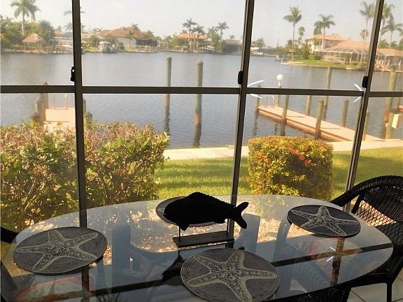 Great DIRECT GULF ACCESS, 1st floor TURNKEY condo with assigned dock. This 2 bedroom, 2 bath unit is tiled throughout, has stainless steel appliances and a full-sized interior washer and dryer, plus a large storage room with shelving. The oversized 28' "all season" Lanai offers fabulous Waterview's of the 200' Orchid Canal and intersecting Peachtree Canal with Southern exposure. Large, heated community Pool and Clubhouse amenities. Minutes, bridge free, to the Caloosahatchee River from your backyard dock! Assigned carport and guest parking outside your door.