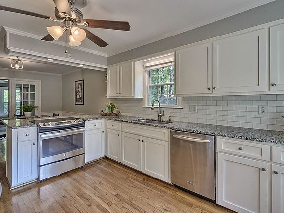 - RoomKitchenFeatures: Granite Counters, Recessed Lighting, Ceiling Fan(s), Eat-in Kitchen, Bay Window, Floors-Hardwood, Bar, Backsplash-Tiled, Cabinets-Painted