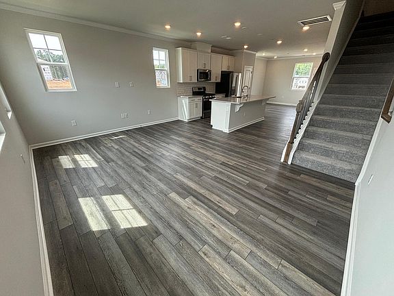 This is a new three-story end unit townhome. The first level features a bedroom, perfect for guests or a home office. The second level boasts an open-plan main living area with a balcony attached to it. The third level includes two bedrooms, both with walk-in closets, including a luxurious master suite. Additionally, the third floor has a convenient laundry room and extra storage space. The home also includes a one-car garage.