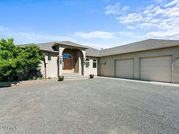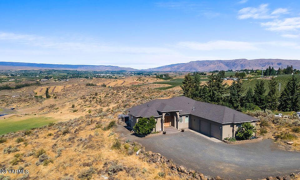 A Naches Heights rambler offers stunning 360 degree views. A custom build with two living spaces, ample windows allow for plenty of natural light, an entertainer's kitchen and a patio that will not disappoint. Soak in the hot tub and relax, sip coffee while listening to the soft flow of the fountain or grill a family dinner with a view. This home offers three bedrooms all conveniently located on one level with an attached three car garage. A built in Murphy bed in one bedroom allows for a multi-functional space. Situated on just over 8 acres. Surrounded by beautiful Yakima Valley orchards but only minutes from town. Tours available by appointment or scheduling with your Realtor.