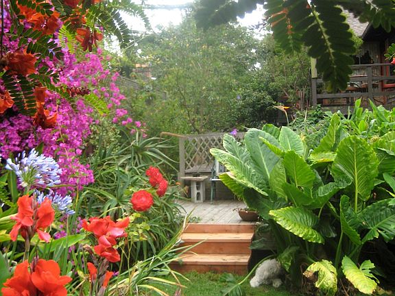 AVAILABLE: August 1: Great location close to BART, downtown, UC, and shopping. Charming downstairs apartment in a triplex on a quiet tree-lined street in North Berkeley. The walk score is 95. There's always street parking with a $60 annual city residential parking permit. Best of all there are two large bedrooms with one that can create a separate office. And the living room looks out onto a shared flowering tropical garden with a deck with a bench and table and chairs. Plus a free washer and dryer and some storage space in a garage. All are shared with two other apartments. This is a one-year lease; 10 months considered. Renewable by the year.