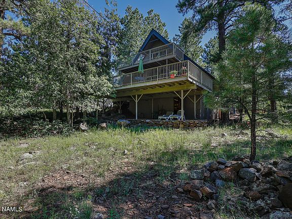 Spacious chalet nestled on a beautiful 15,175sq ft lot. Magnificent oak and pine trees surround the very private deck area. Enjoy the 600 sq ft of maintenance free decking. Soaring vaulted ceilings and gorgeous stone fireplace make this your perfect cabin in the pines. Newly renovated kitchen and bathrooms. 50 year shingle roof installed in 2018. 2 ample sized bedrooms on the main level and the spiral staircase leads to the primary bedroom upstairs and a large loft area. Roomy workshop in the basement.
