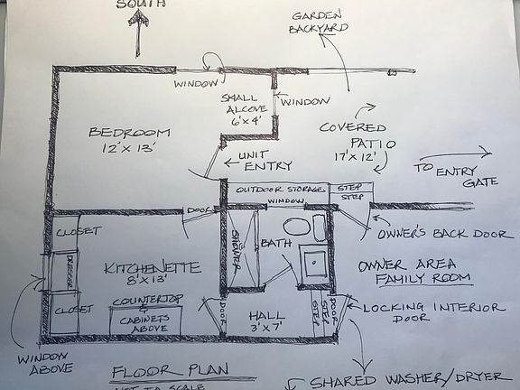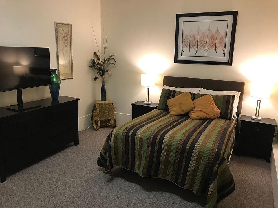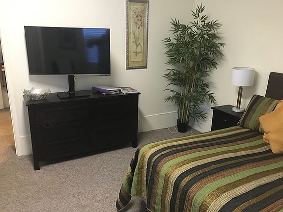 This large, studio apartment is FURNISHED (but we have some attic storage to exchange with your things to make it partially furnished, if desired). It is newly renovated and was the former master bedroom with private bathroom, and it now has new carpet, paint, and a beautiful acacia wood countertop bar in the kitchenette. The kitchenette is in one room with a desk, clothes closets, and separated by a door from the large bedroom. The kitchenette has a microwave, small fridge with separate freezer door, a ceramic, two-burner cook top, toaster oven, and several other small appliances for cooking. A bar sink and kitchen faucet have been installed in the separate and private bathroom down the small hallway from the kitchenette room. That hallway also gives access to the main part of the house, separated by a locking, interior door. Tenants have access to the washer and dryer (large capacity) in the main part of the house on any days needed, we just ask for 24-hour notice so we can clear the wash room for your use and unlock the interior door. There is a separate, exterior entrance to the apartment unit off of the covered patio, and a well-lit, concrete walkway from the front parking area around the side and back to the unit. All utilities are included in the $1300/month rent, plus free WiFi (strong signal with booster near the apartment). A dedicated, off-street parking space is available, and we can possibly work out an arrangement for EV charging (we have a Chevy Bolt we charge under the carport). Please note that the washer/dryer is shared with us in the main part of the house. For the past year, various tenants through the traveling nurse program (Furnished Finder website) have rented from us and with a 24-hour notice, we unlock the interior door into our family room area so tenants can use the washer/dryer that day. Some tenants have just set a weekly day for such. The bathroom is entirely private and has a large shower, with a bar sink to make the kitchenette usable.