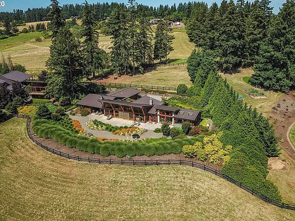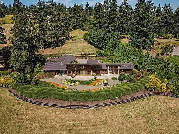 Spectacular! Custom designed one level by Curt Olson, gorgeous landscape by Michael Schultz! 5 acres on top of Parrett Mtn. View, 4 stall Barn, separate office/guest suite. Walls of 18 ft tall windows. Top quality throughout. Just 10 mins to either Sherwood or Wilsonville, 30 mins to downtown Portland. This home is a one of a kind beauty. Must see to fully appreciate!