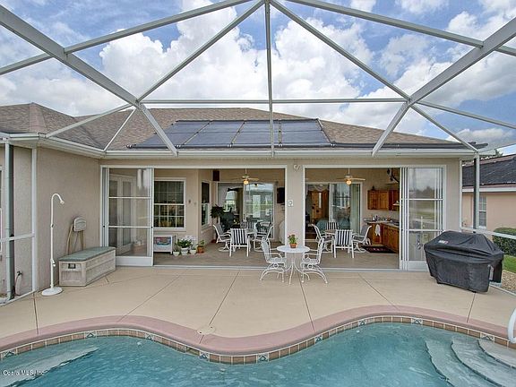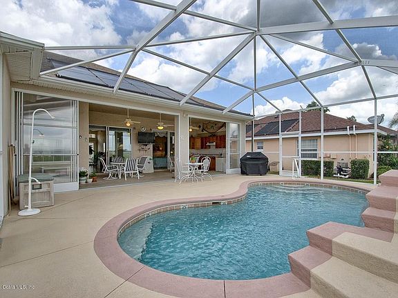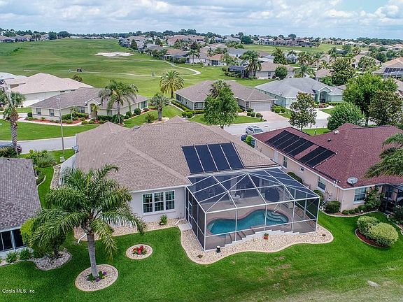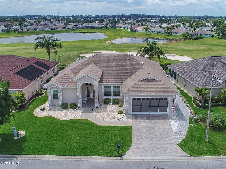 STONECREST ADULT GOLF COURSE COMMUNITY WITH PRIVATE ROADS AND SECURITY. ALL THE AMENITIES AND 2 MILES FROM THE VILLAGES. GOLF CART ACCESS WITH THIS GOLF CART COMMUNITY. THIS CONCRETE BLOCK AND STUCCO POOL HOME IS LOCATED ON THE CHAMPIONSHIP GOLF COURSE (10TH FAIRWAY) WITH VIEWS OF TWO PONDS. 10 AND 12 FT VOLUME CEILINGS THROUGH OUT. OVERSIZED GARAGE (24X23) WITH SEPARATE GOLF CART GARAGE ENTRY. BOTH GARAGE ENTRY HAVE SCREENS OVER GARAGE DOORS, PAINTED GARAGE FLOORING, GENERATOR, TANK LESS HOT WATER SYSTEM, SOLAR HEATING FOR POOL, CONCRETE STAMPED DRIVEWAY/WALKWAY AND PATH TO GOLF CART ENTRY. QUARTZ COUNTER TOP IN KITCHEN, NEWER ROOF, NEWER A/C, NEWER WINDOWS, SUMMER KITCHEN, WATERFALL INTO POOL, SPLIT BEDROOM PLAN AND OPEN DESIGN FLOOR PLAN, SOUTHERN EXPOSURE, NEWER REFRIGERATOR AND MICROWAVE THAT IS CONVECTION. FLOORING IN MAIN FLOOR PLAN IS TILE AND LAMINATE. BEDROOMS HAVE CARPET. 8 FT SLIDING GLASS DOORS OFF MASTER BEDROOM TO POOL AREA. VIEW OF POOL AND GOLF COURSE FROM ALL AREAS OF HOME (EXCEPT FOR GARAGE AND 3RD BEDROOM). THIS HOME IS COMPLETELY UPDATED, AND IN PRISTINE CONDITION. DO NOT MISS THIS BEAUTY!