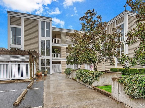This once nice!! Secured entry rare find lower floor corner unit no stairs 2 bedroom 1 3/4 bath with 1395 sq.ft and 2 car garage parking. Unit has nice open floor plan with tiled entry, painted mill work, gas fireplace, slate floor kitchen w/ sitting bar, tiled baths, good sized master w/walk in closet, private sitting deck w/ water views, full size utility room, storage room, elevator access to garage & park like grounds w/fishing/boat dock, kayak launch, and walking trails to burke gilman.