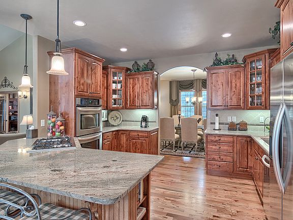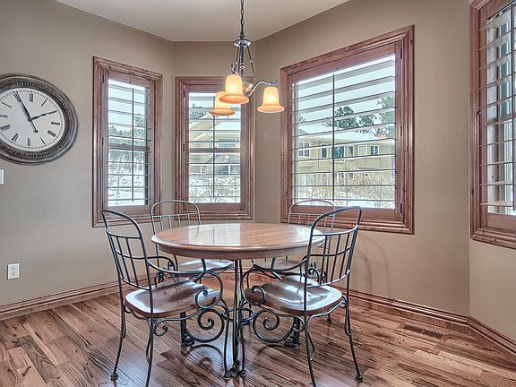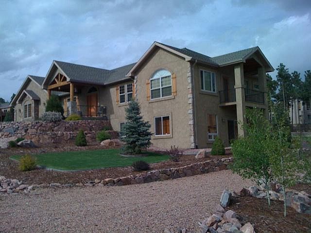 Simply stunning ranch home that shows like a model Open functional floor plan in highly sought after Timberview area Features include stone and stucco exterior gleaming hardwood floors throughout the main level gorgeous stone wall in great room wgas fireplace and built ins vaulted ceiling with a wall of windows overlooking the back covered trex deck with iron railings spacious formal dining room Gourmet kitchen with slab granite counters stainless steel appliances double ovens and gas cooktop large nook large pantry laundry and mud room with storage office on main with French doors fabulous master with Pikes Peak and mountain views double sided fireplace 5 pc master bath with tile floors deep soaking tub walkin closet with builtins fully finished lower walkout level wet bar three additional generously sized bedrooms one Jack and Jill and one en suite 9 ft ceilings 2 car under garageworkshop with epoxy floor professionally landscaped on a fabulous lot A must see