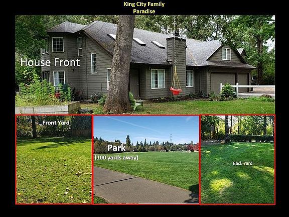Property Summary: Located in King City. 18,684 Sq Ft. including a lawn for play 95% Fenced Huge forest surrounds you on three sides. Tree house in back yard Surroundings: Deer Creek runs to the West Surrounded by 1.5 acres of protected land where o Birds are singing o Frogs are croaking o Crickets are chirping o Deer, raccoons, opossums, skunks, and frogs are living o King City Community Park is 100 yards away o Deer Creek Elementary at the top of your street o Tigard/Tualatin Schools (Top 26 of 130 schools in the Metro area - 20%) o Hard wood floors in family, dining, half bath, kitchen and computer room o 710 Sq. Ft. Deck off family and dining rooms o Formal Dining room with Wayne's coating and glass French doors o Open Kitchen has granite counters, double oven and pantry o Laundry room is downstairs with cabinets, storage and laundry shoot o Family room off kitchen with eating nook o Computer room off Family room o Internet and Cable ready in all rooms o Central gas heat, Air conditioning Gas Fireplace in Living o Master bathroom has two vanities, shower, and Jacuzzi view of Deer Creek