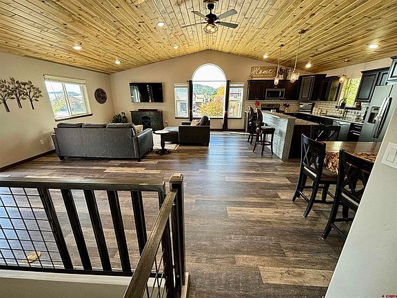 Nestled in the charming town of Bayfield, this delightful three-bedroom, three-bathroom residence offers a perfect blend of contemporary-Mountain style and functional living. Situated in the sought-after Dove Ranch subdivision, this home boasts breathtaking views of the majestic La Plata Mountains, providing a picturesque backdrop for your daily life. It was built by RT Construction in 2019. This spacious 2,340-square-foot home showcases high-end finishes, such as blue pine ceilings, solid wood doors, trex decking, granite countertops, and GE slate kitchen appliances. Built with storage in mind, it offers two storage rooms downstairs, storage space upstairs, and additional space in the garage. The heart of the home features an expansive kitchen that seamlessly flows into an open living area, creating an ideal space for relaxation and entertainment. The primary bedroom is a tranquil retreat, while two additional bedrooms offer comfort and versatility. Outdoor enthusiasts will appreciate the large privacy fence, which encloses a backyard and your very own Peach Tree! Enjoy gardening, or simply basking in the Colorado sunshine. The attached oversized two-car garage provides ample storage for all your recreational gear, from skis to bicycles. Conveniently located just minutes from downtown Bayfield and a mere 25-minute drive from vibrant Durango, this property offers the best of both worlds - small-town charm with easy access to urban amenities. Nearby attractions include Downtown Bayfield and the serene Gosney Park, perfect for afternoon strolls or picnics. Whether you're looking for a permanent residence or a mountain getaway, this home in Bayfield presents an opportunity to embrace the Colorado lifestyle in comfort and style. Don't miss your chance to make this slice of mountain paradise your own!