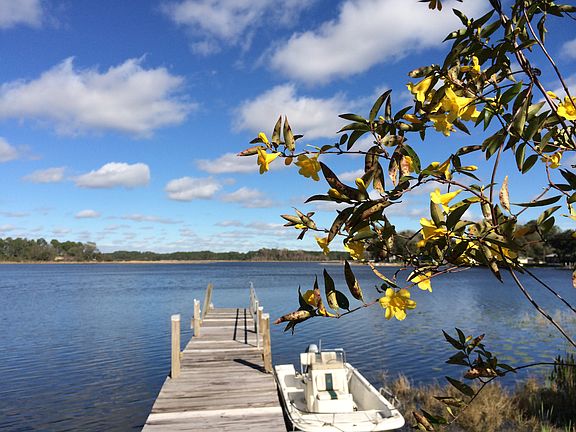 Lovely two story lakefront Florida Vernacular home with detached single car garage. This charming house feels comforting, like it is the real Ole Florida. The view from the deck is all lake and hardly any notice of a neighbor. It is a place where you spend your days enjoying the fresh water, fishing for bass, swimming or boating on private, 480 acre non-public access Lake Broward. The backyard includes deck, dock, cleared beach and swimming area, as well as a nice covered porch and private outdoor shower.