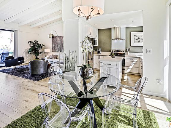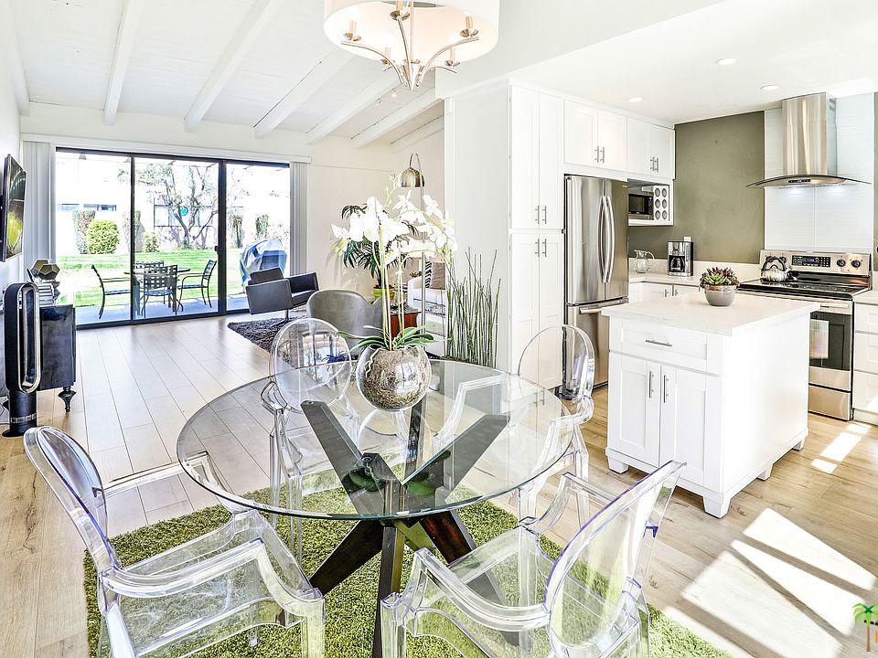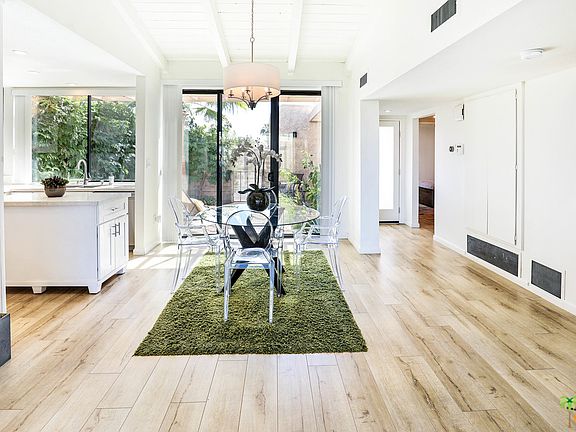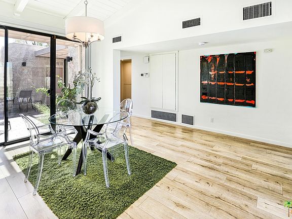 Located in Central Palm Springs, this split bedroom plan condo on LAND YOU OWN and updated 3 years ago provides double pane windows and sliders, vaulted ceilings, and a glass front door allowing an abundance of light into the unit. The island kitchen with white cabinetry, recessed lighting, quartz countertops and stainless appliances is special. The dining area and guest bedroom each has a tall slider overlooking the private south-facing stone and landscaped patio providing direct access to a 1-car garage with laundry area. The living room with vaulted ceiling and master bedroom provide tall sliding doors to separate patios overlooking a large green lawn maintained by the HOA. The en-suite master has 2 beautiful vanities, a tiled shower and glass and metal closet doors leading to the walk-in closet. Guest bath, with beautiful vanity, offers a shower/tub combo. Located close to downtown Palm Springs and all its amenities, you will enjoy desert lifestyle living in this special oasis.