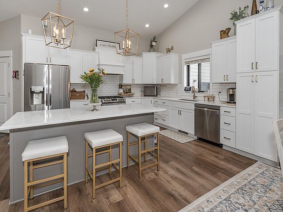 As you enter, the main level welcomes you with soaring vaulted ceilings and a cozy corner fireplace in the living room, perfect for making memories. The natural light streaming through large windows fills the space with warmth and offers a picturesque view of the backyard. The kitchen is a heart of the home, featuring stylish quartz countertops, top-notch LG appliances, and an island that invites gatherings. Adjacent to it, the dining area shines with modern lighting and opens up to the great outdoors via sliding doors.