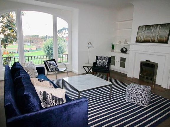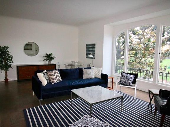 Large living room overlooking Moscone Park open to dining room and entry stairs/hall