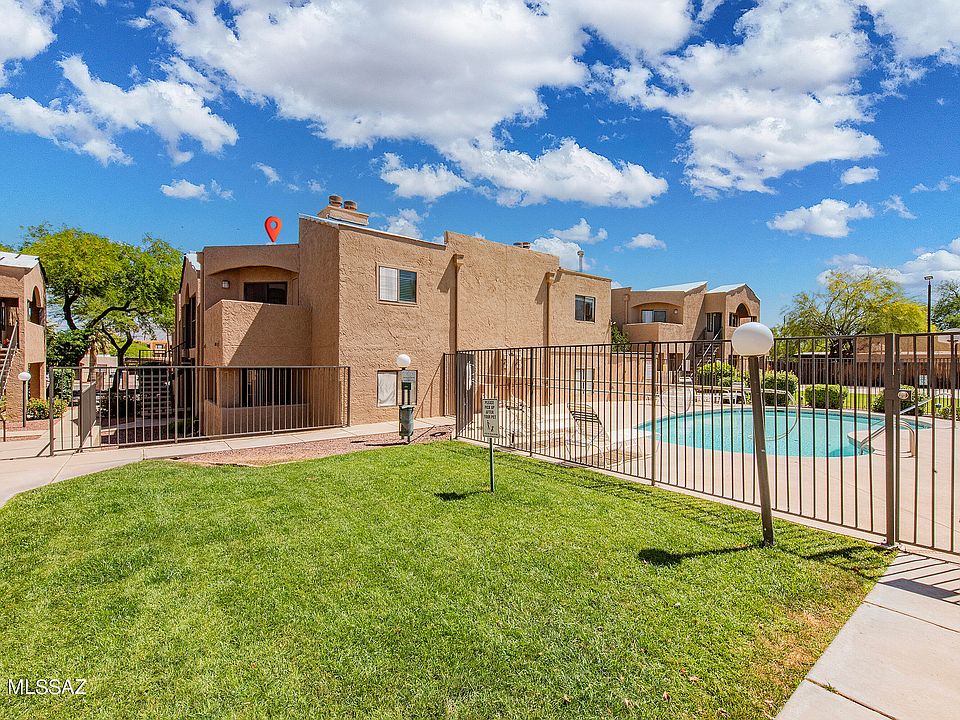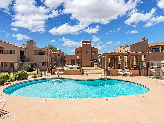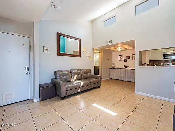 Looking for a delightful, low maintenance condo in a peaceful, centrally located and gated community? Or the perfect home your college student: no dorm fees and equity to gain? This open concept 2 bedroom/2 bath home features tall, vaulted ceilings, abundant light from clerestory windows, updated bathrooms, stainless steel appliances, white shaker cabinets in kitchen, in-unit washer, has no carpet and comes furnished. The upper unit offers privacy no noise from neighbors above. The balcony faces common area and pool with no neighbors too close. HOA fees are an outstanding value not only covering pool, laundry facilities, clubhouse but also, water, sewer, trash AND internet! 2.2mi from UofA, conveniently close to dining, shopping, public transit, and Mountain Ave Bikeway. 2 parking spaces