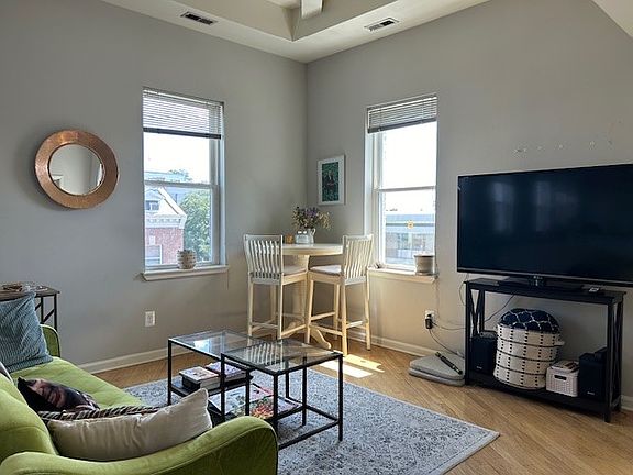 LOVELY, LIGHT-FILLED PENTHOUSE Rarely available top floor condo: unique NYC-loft-like open floor plan with columns, wrap-around windows, skylights, soaring ceilings, hardwood floors, wood-burning fireplace, built-in bookcases, new HVAC with powerful a/c + heating, pristine galley kitchen with granite bar/seating, stainless steel appliances, separate dining area, tile bathrooms, soaking tub, walk-in shower, washer/dryer. Don't live in a cookie-cutter 'box' with a zillion others! Choose instead this quiet, private, two-apartments per floor historic condo building (only 7 units total)! Just steps to your morning coffee and gym. Harris Teeter is right around the corner--plus an abundance of jazzy restaurants, cafes and shops. COVETED PRIVATE PARKING also available. Yours will be the only unit with designated off-street parking directly behind the building. Accommodates 2 cars-tandem. . Move in fee $200. Renter is responsible for Utilities No pets One Year lease No Smoking