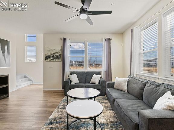 Welcome to this beautifully designed 3-bedroom, 3-bath townhome, centrally located in the rapidly growing area near Interquest Parkway. This home offers an ideal combination of modern convenience, natural beauty, and easy access to everything you need. Upon entering, you'll be greeted by an abundance of natural light flooding the open floorplan. The spacious living area offers picturesque views of the surrounding open space and park, providing a peaceful and serene atmosphere. The main level features a large eat-in kitchen that seamlessly opens to the living area, perfect for both cooking and entertaining. A convenient powder bath and direct access to the two-car garage complete the main floor. The kitchen is a chef’s dream with two large windows on either side of the gas range, bringing in plenty of sunlight while you cook. Enjoy the sleek granite countertops, making meal prep and cleanup a breeze, along with a generously sized pantry for additional storage. Upstairs, you'll find a well-appointed primary bedroom and bath, providing a private retreat. Two additional bedrooms share a convenient Jack-and-Jill bathroom. The loft area, complete with built-in shelves, creates a perfect work-from-home space or cozy reading nook. The upper level also includes a laundry area for added convenience. This home is equipped with ceiling fans throughout, ensuring comfort year-round. Its central location provides easy access to major highways, including I-25, Hwy 83, and Powers Blvd. You’ll love being able to walk to the nearby movie theater, restaurants, and enjoy the close proximity to a gas station and hospital. Don’t miss out on the opportunity to own this gorgeous townhome in a prime location with all the amenities you need for modern living.