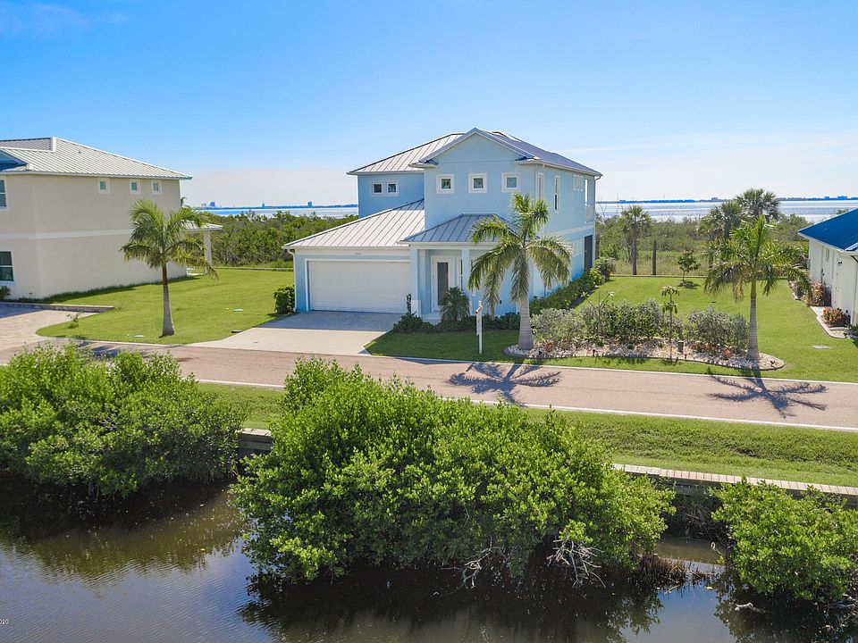 Stunning brand new never lived in Key West style home near the eastern shore of Merritt Island. This home has 80 feet of vinyl bulk-headed seawall with canal frontage & direct access to the Banana River. The home features a modern beach feel with amenities you will appreciate. Coffered ceilings, wainscoting in main areas, laundry up & down, master suites up & down, jetted tub, walk-in showers, walk-in closets, office/option 4th bedroom, trussed patio & balcony, vaulted ceiling entryway, insulated impact glass & exterior doors, dual air conditioning systems, all concrete block construction, maple cabinets with granite tops, new SS appliances, induction cooktop, central vacuum system, alarm system, 10' ceilings & LED lighting, screened in-ground heated saltwater pool, aluminum metal roof, insulated attic, tiled and engineered wood floors and staircase. High efficiency aerobic septic and drain field system.